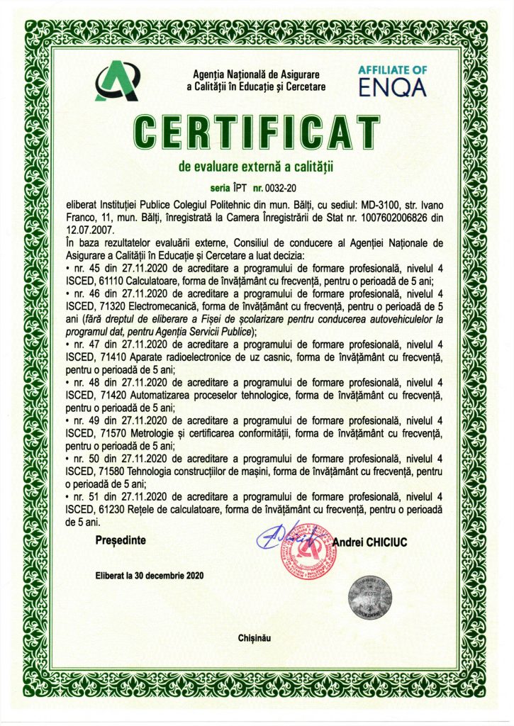 seria ÎPT nr. 0032-20. Colegiul Politehnic din mun. Bălţi este o instituţie de învăţămînt profesional tehnic postsecundar și postsecndar nonterțiar, care asigură pregătirea cadrelor de specialitate pentru economia naţională în domeniile: Mecanică și prelucrarea metalelor; Tehnologia informației și a comunicațiilor; Electrotehnică și energetică; Electronică și automatică.